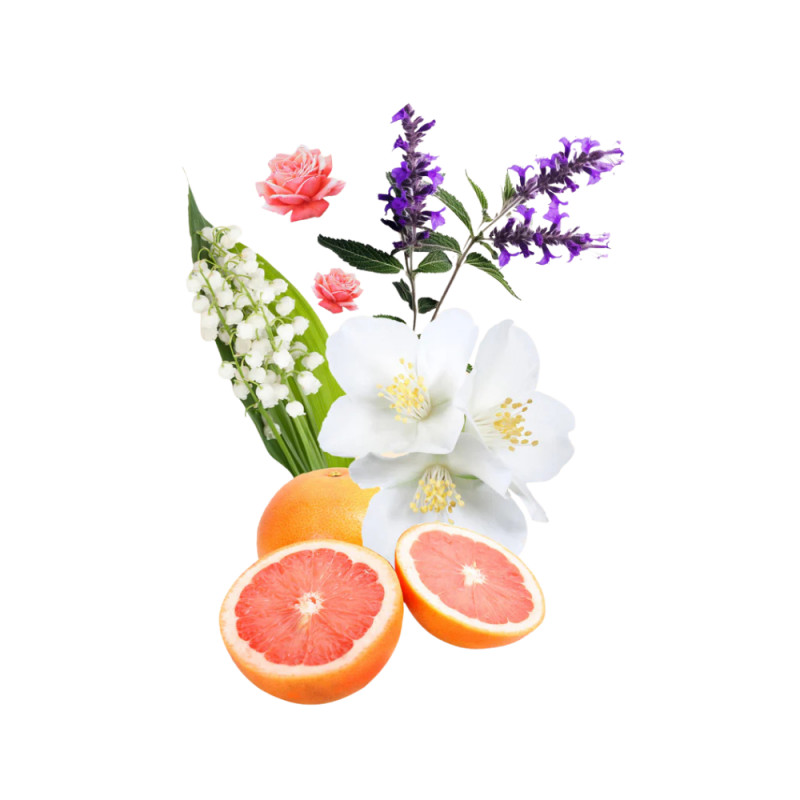 En cœur, un bouquet délicat de jasmin et de rose dévoile une élégance florale intemporelle, subtilement adoucie par la pêche veloutée et la fraîcheur cristalline du muguet. Cet accord harmonieux fait naître une fragrance à la fois sophistiquée et lumineuse.
