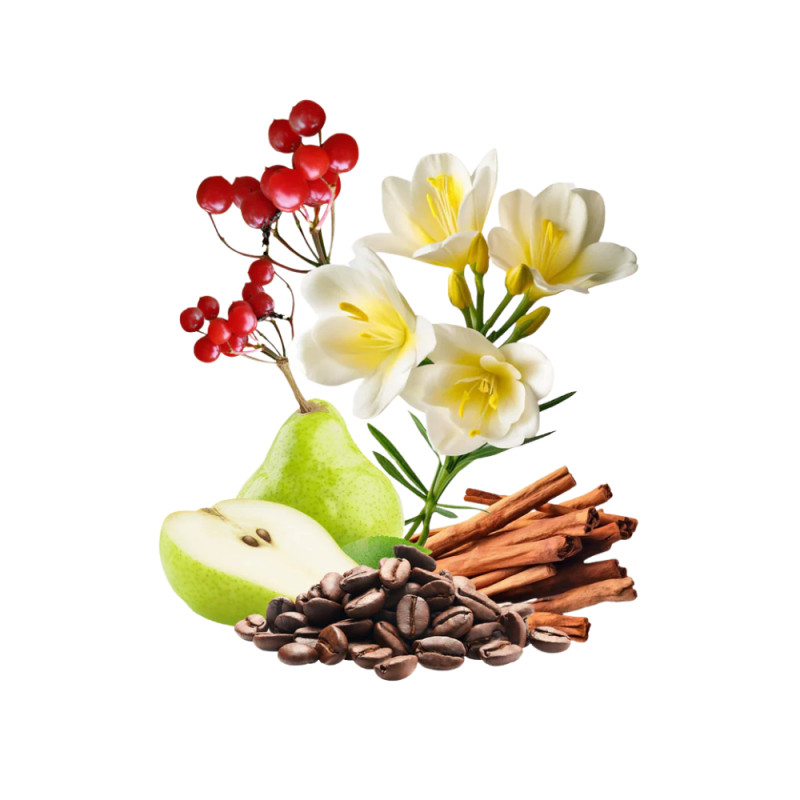 Dès les premières notes, les baies roses piquantes, la pomme croquante et la poire juteuse dévoilent une ouverture fruitée, pétillante et effrontée. Le citron éclatant apporte une fraîcheur vive et lumineuse qui dynamise la fragrance.